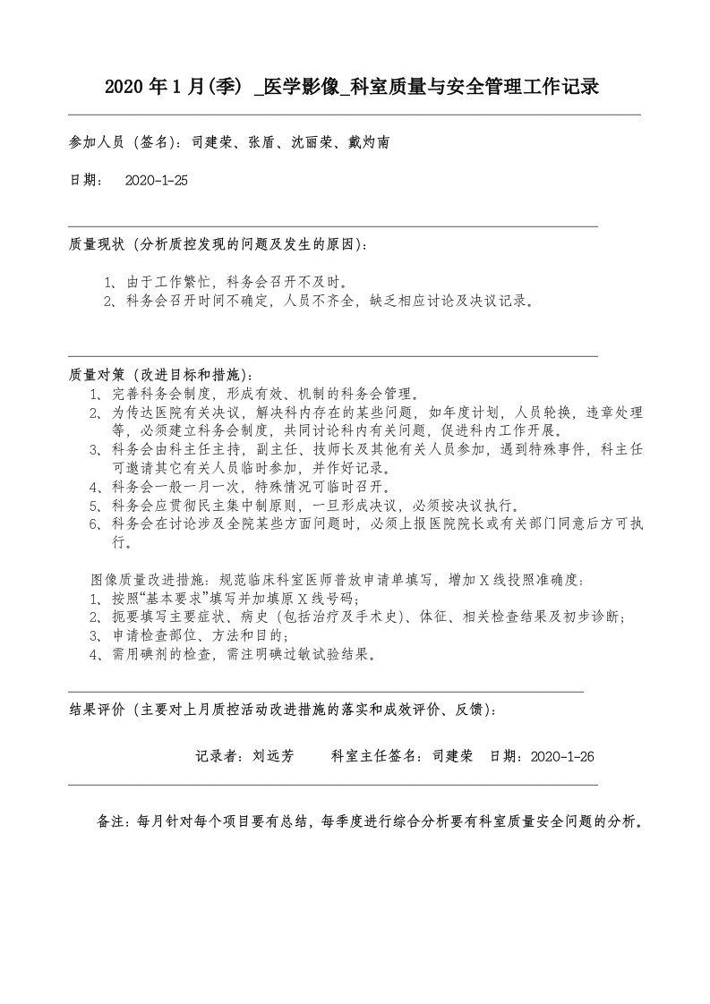 2020年1月科室质量监控安全记录