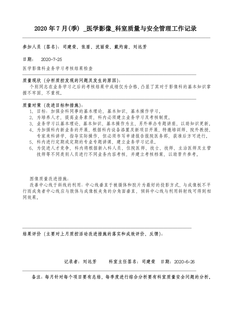 2020年7月科室质量监控安全记录