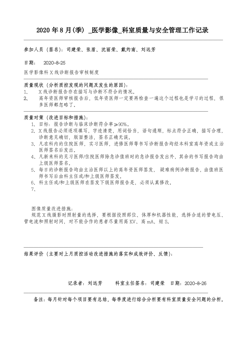 2020年8月科室质量监控安全记录