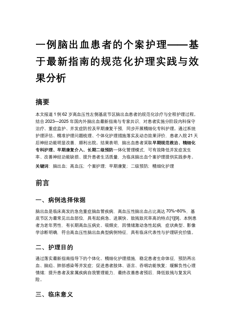 一例脑出血患者的个案护理——基于最新指南的规范化护理实践与效果分析